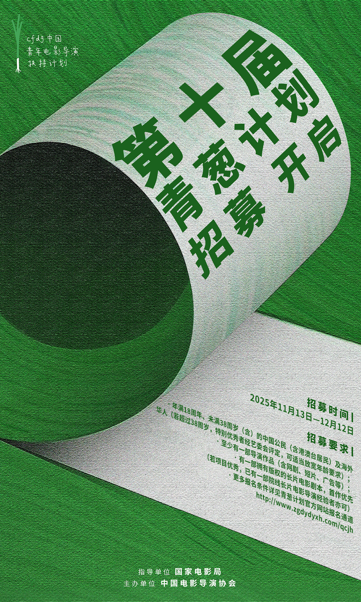 11月13日,中国电影导演协会宣布,第十届青葱计划(中国电影导演协会“中国青年电影导演扶持计划”)正式启动,学员招募通道亦全面开启。即日起至12月12日,符合报名要求的导演可登录青葱计划官方网站报名通道报名。